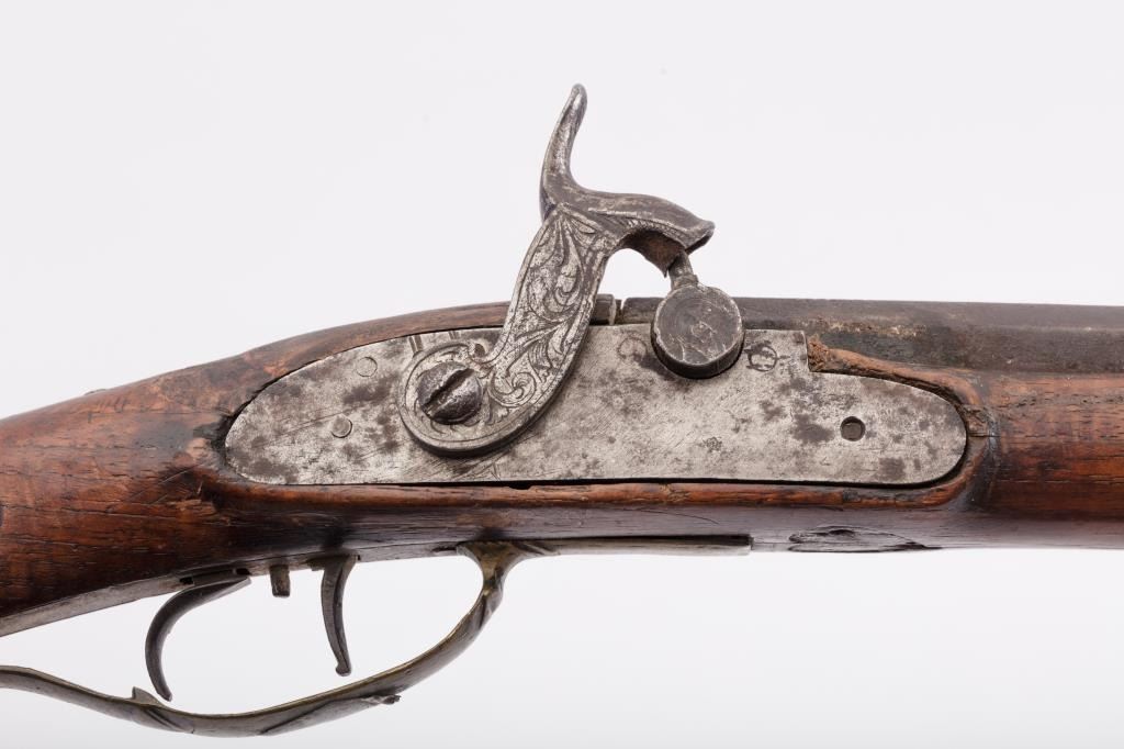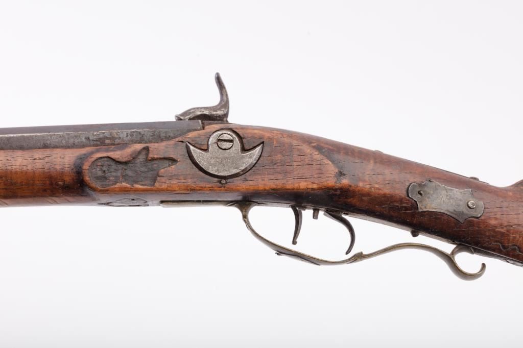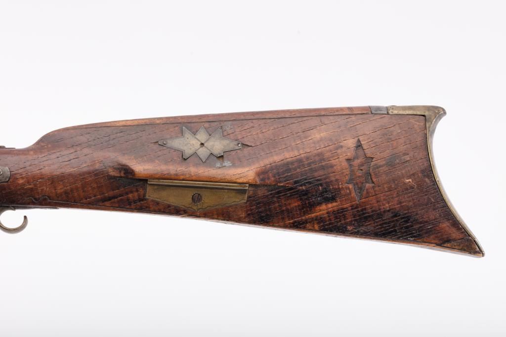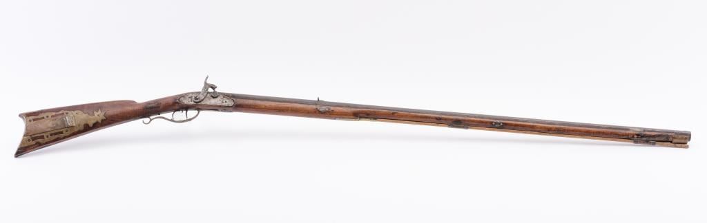 Interesting full stock transition Kentucky to Plains rifle with southern styling and silver inlay scratch engraved in block letters “MANNEN” by tradition a Texas pioneers rifle collected by early NorthernCalifornia collector. Measures 56” overall with a 41” barrel of approximately .38 caliber rifled (Note: barrel was originally 2”-6” longer and reduced long ago during use and nose cap repositioned. Pierced patch boxwith 5 pointed star. Six sheet silver inlays with two missing. Old frontier conversion to percussion. Characteristic steel half-moon escutcheon around single lock screw. Fair to good condition showing gray/brown patina onmetal with minor rust and erosion. The stock shows honest wear, damage to nose near muzzle, and missing inlays along with other minor imperfections. Uncleaned and “As Found” in Northern California by old collector. Agun that traveled west and could have begun life in the south or Texas. (Antique) Est.: $750-1500
