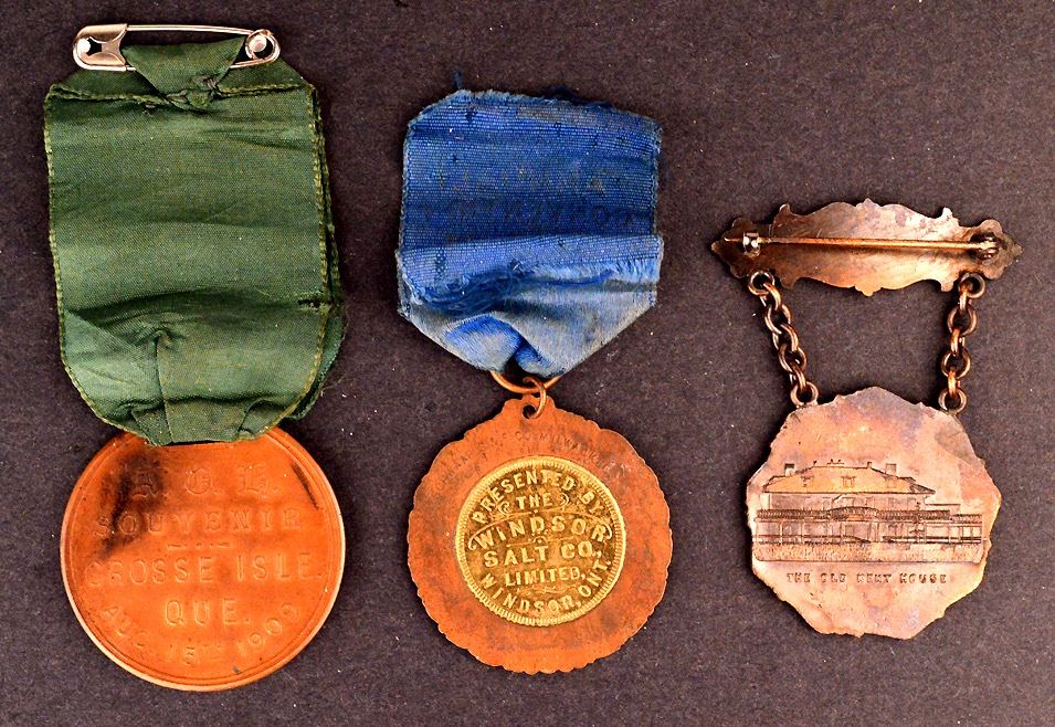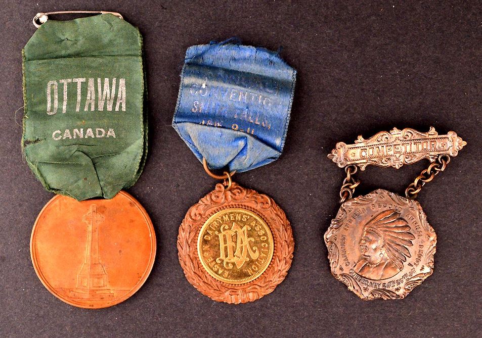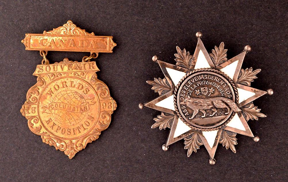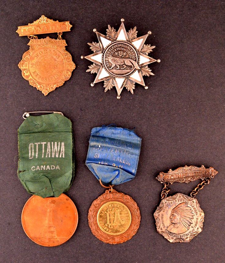 (1)- Eastern Dairymens' Association, Annual Convention, Smith Falls, Jan. 9-11, 1901, "Presented By The Windsor Salt Co. Limited, Windsor, Ont.", two part construction, with the central medallion, Brass, 23.5mm, inserted in an Ae frame, with decorative wreath, 36mm, ring suspension, faded blue ribbon. by Schwaab & S. Co., Milwaukee. VF; (2)- Obv: Native with full headress 3/4 face left, "Canadian Indians Second Annual Shoot, Quebec May 24th-27th, 07"; Rev: Building, "The Old Kent House"; on 9 sided disc, Ae, 34.5mm, with suspender, and bar, "Competitor"; VF. Shoot mentioned on Page 24 of April, 1907 Sporting Life, with over $1000 in cash prizes; (3)- brooch, Fox at centre, Maple Leaves and Quebec Coat of Arms, above, "Ass. Des Eleveurs De Renards De La Prov. De Quebec", white enamel and silver, with 8 pointed star, and palm leaves between points. Ar, Sterling, 50mm, VF. Sturdy construction; (4)- Ancient Order of Hibernians, Ae, 38.5mm, CH#1100, with green ribbon, "Ottawa Canada", VF, ribbon tattered; (5)- World Columbian Exposition, 1893, Souvenir, with bar CANADA; Ae, 39mm, Fine; total 5pcs.