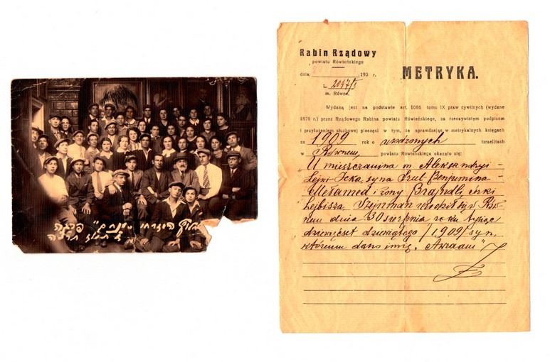 Interesting group photo of the Jewish youth movement HeChalutz HaMizrachi in the Praga district of Warsaw, 1935, and a document by Rabbi Rachidovi, 1930, flawed photograph: lower right corner missing, stain on the upper part and creases on both sides of the right and left margins. On the back of the photo is a round ink stamp: "Kibbutz of the Mizrachi Pioneer in Kam'yanky, and the stamp of the photography studio Warsaw. Dimensions: 12.5x17.5 cm