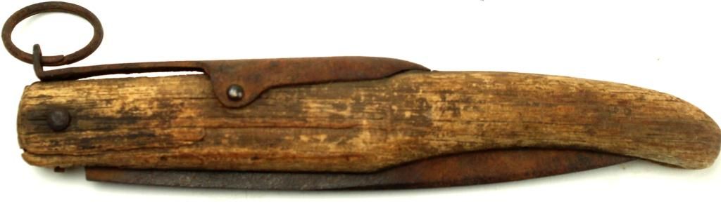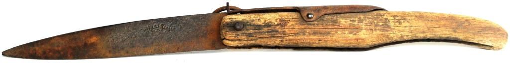 Interesting locking blade relic knife, 13" long, blade marked refer to photo. Est. 100-175