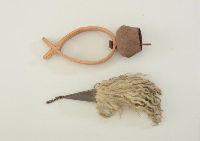 Interesting lot consisting of an old metal bell affixed to a bent wood collar, possibly for a small animal (lamb or goat) and an old wool and metal cone hanger; from an old estate that previously collected Indianartifacts; these items may have been Southwestern Indian-related and definitely show age. Est.: $75-$150.