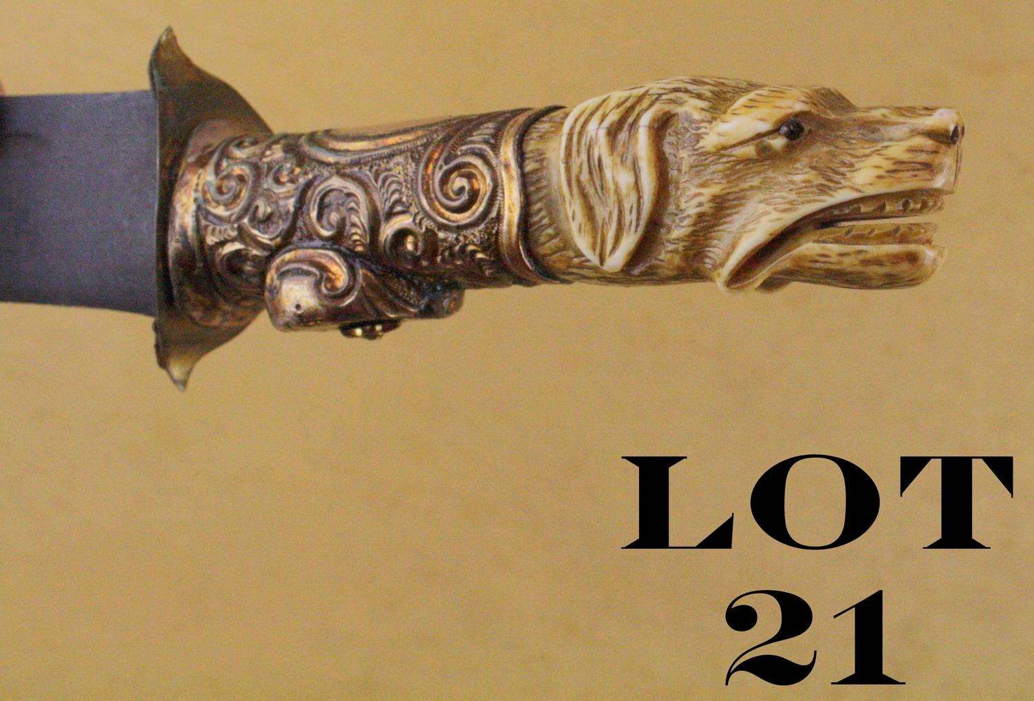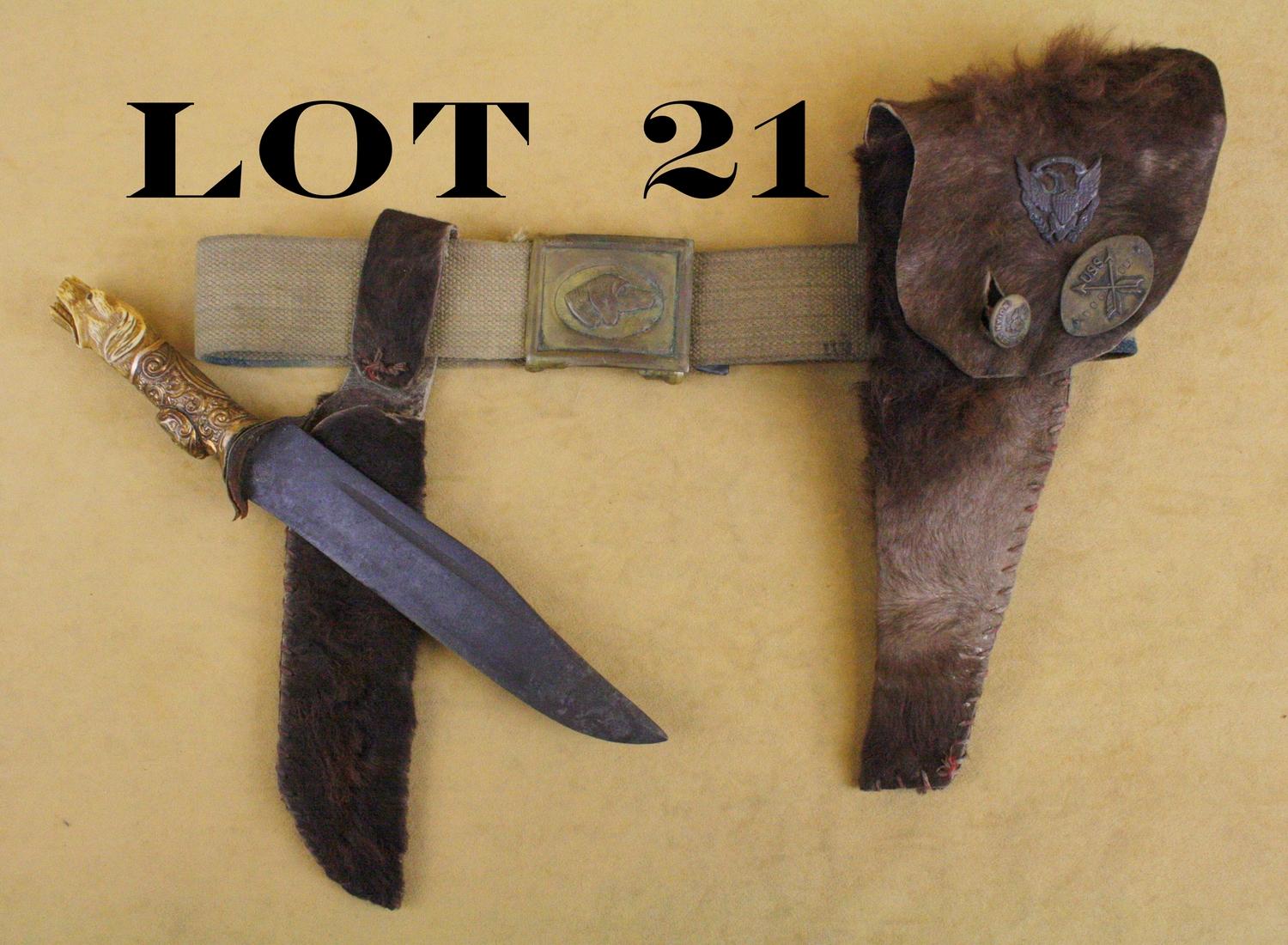 Interesting lot containing a deer hide flap holster, deer hide knife scabbard, crudely made knife with brass and dog head grip, all age unknown, and an Anson Mills woven tan military style belt with dog head brassbuckle. The holster is decorated with brass garniture including a USS crossed arrows brass tag (age unknown), brass U.S. Indian service button that appears correct and a spread eagle brass emblem that appears old;the knife is approx. 13” overall with an approx. 9” blade showing a heavy patina on the clip point blade, brass ornamented grip with carved doghead pommel that is nicely accomplished. Est.: $400-$600.