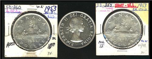 Interesting lot of 1953 silver dollar varieties. Includes a 1953 SF "Small water lines", 1953 NSF "Long water lines" and the very scarce and "Unlisted" 1953 NSF "Small water lines". Coins are AU-50 or better.