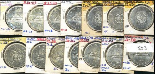 Interesting lot of varieties. Includes a 1961 "Arrow head", 1962 'Arrow head" (5), 1964 "Mising dot" (4), 1966 "dot" (4). Grades vary from EF-40 to MS-62.