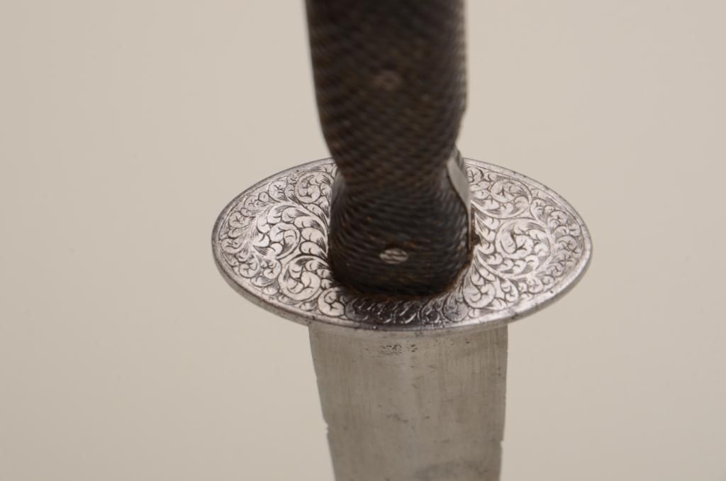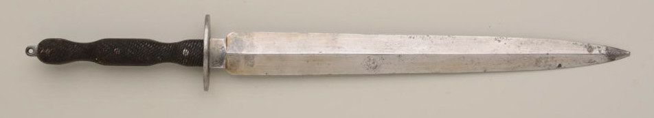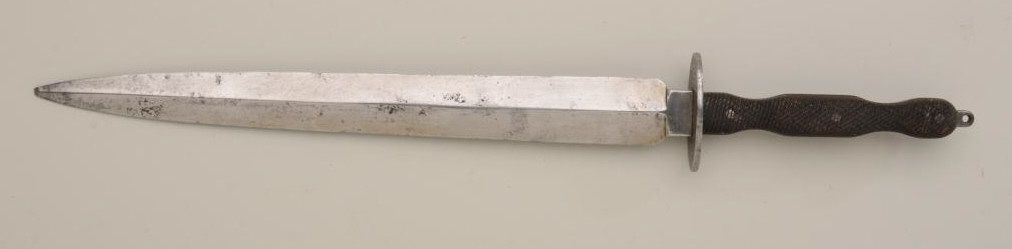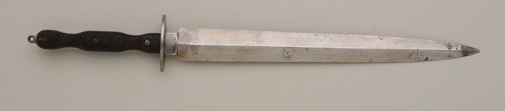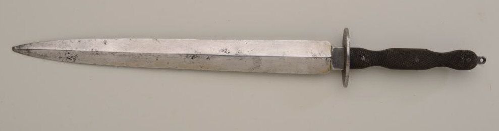 Interesting mid-19th century spear point Bowie knife with small checkered hardwood gripscale, probably American by surgical implement maker, circa 1850s-60s by style. The knife measures 17" overall with 12"blade, the blade measures 1-1/4" across widest point with a thick bolster and precision grind. The tip is bent slightly, the inside of the guard and backside are nicely scroll engraved. There is a loop atthe pommel of the knife for attaching cord. The coarse checkered hardwood grips with finger groove are reminiscent of surgical saws used during the Civil War. The blade is good with some minor erosion and pitting.Interesting. Est.: $1,000-$2,000