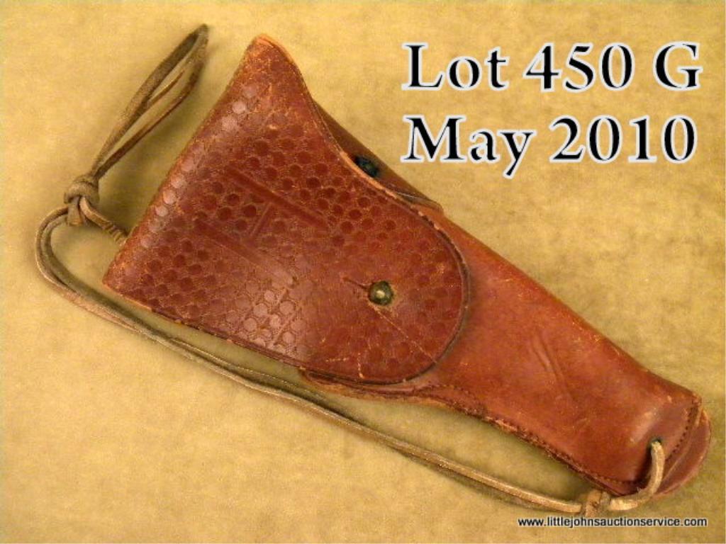 Interesting military style brown leather flap holster for a 1911 Model semi-auto pistol in overall good condition showing tooling and the letter “H” on the flap and the reverse side stamped “Made according to U.S. Govt.Specifications, Brauer Bros. Mfg. Co., St. Louis, Mo.”. Est.: $15-$30.