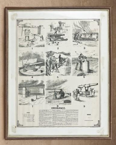 Interesting original print of military canon and ordinance published by Sackett & Wilhelms Litho. Co. New York. Approx. 17”h by 13-1/2”w. Nicely framed. Shows earliest form of catapaults, canon, gattling guns, machine guns, pneumatic gun, machine gun, and multi-charge gun through the year of 1844. 9 vignettes that are numbered in sequence, approx. 5” by 4” each illustrating the aforementioned pieces. The print is in good condition, warping, staining, and minor aging. This print was obtained from the Santa Barbara public library by Mr. Coulter years ago when discarded. A great and scarce item for the ordinance collector, of which we have never seen another. We believe the date to be approx. 1884. Est: $500 - $1000