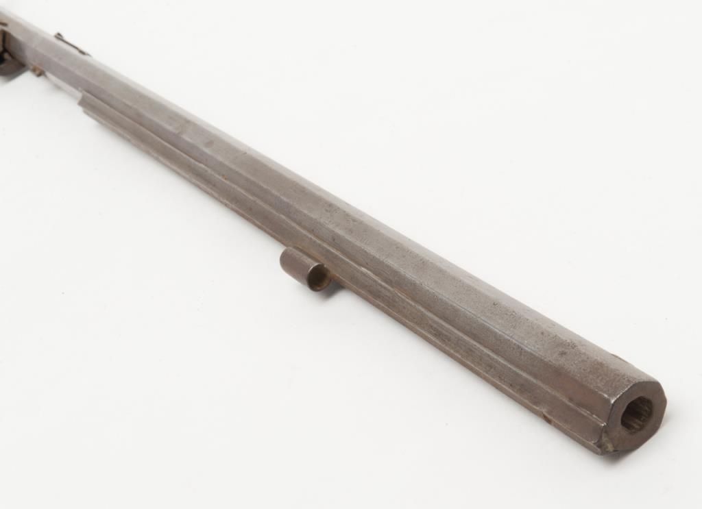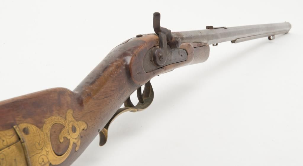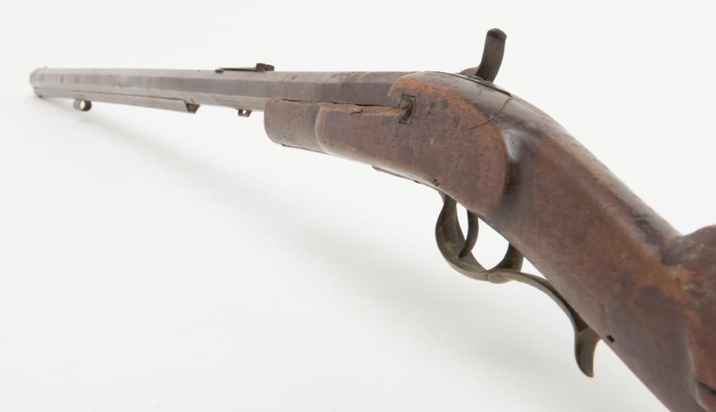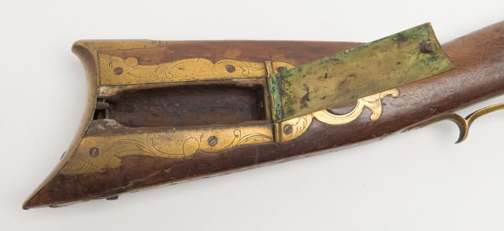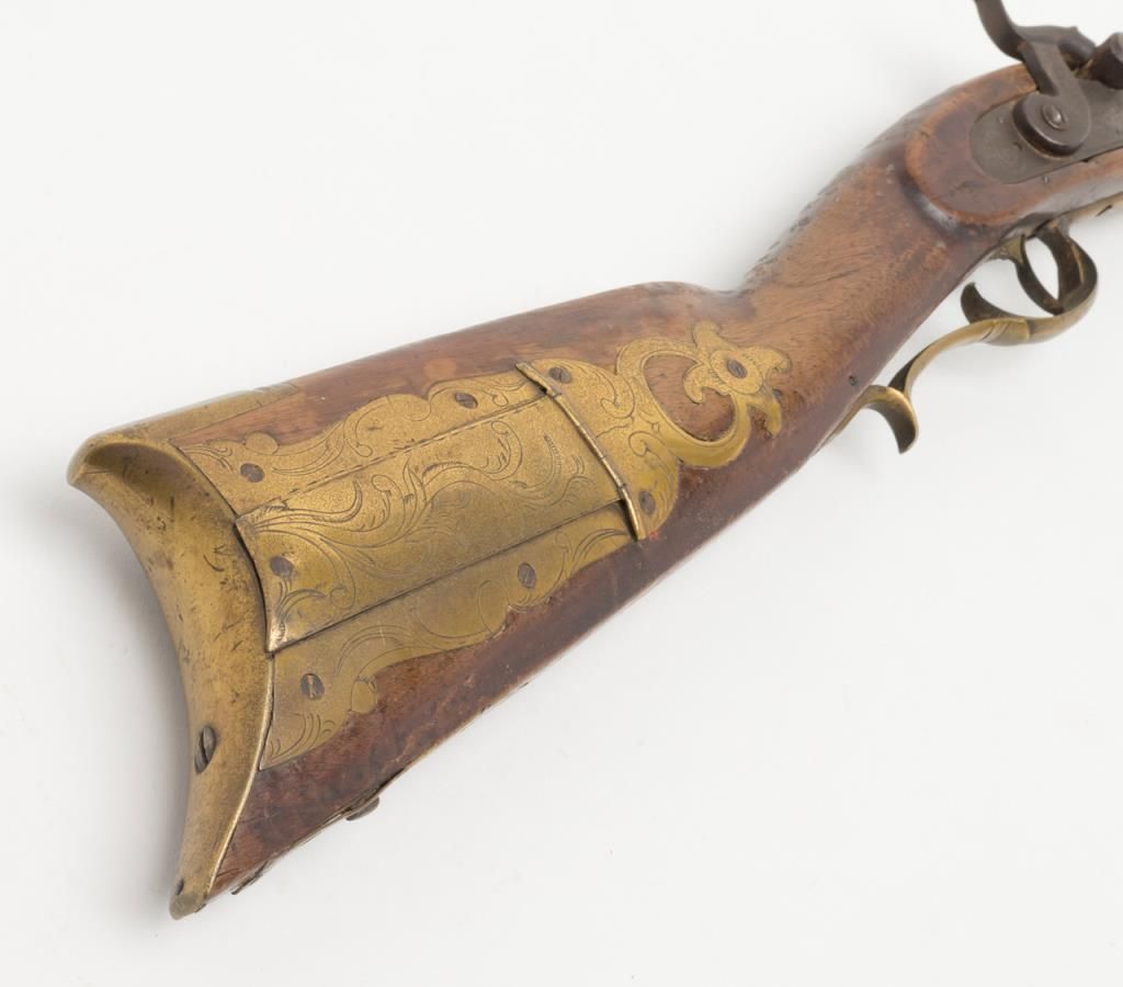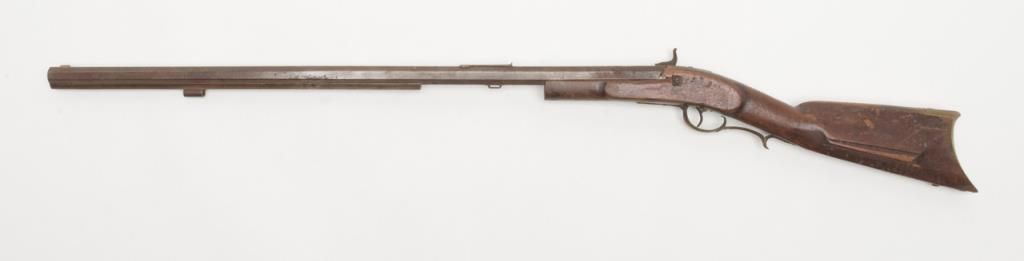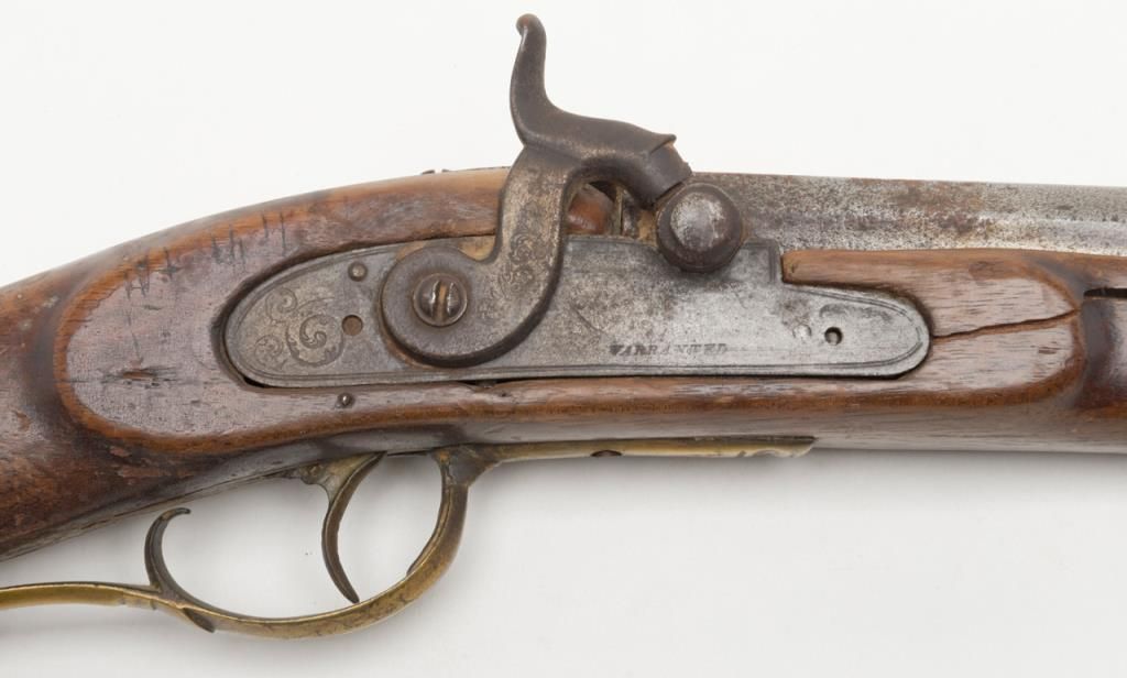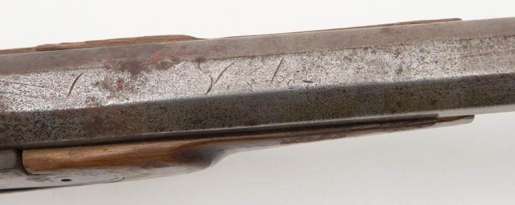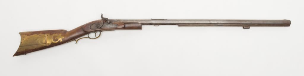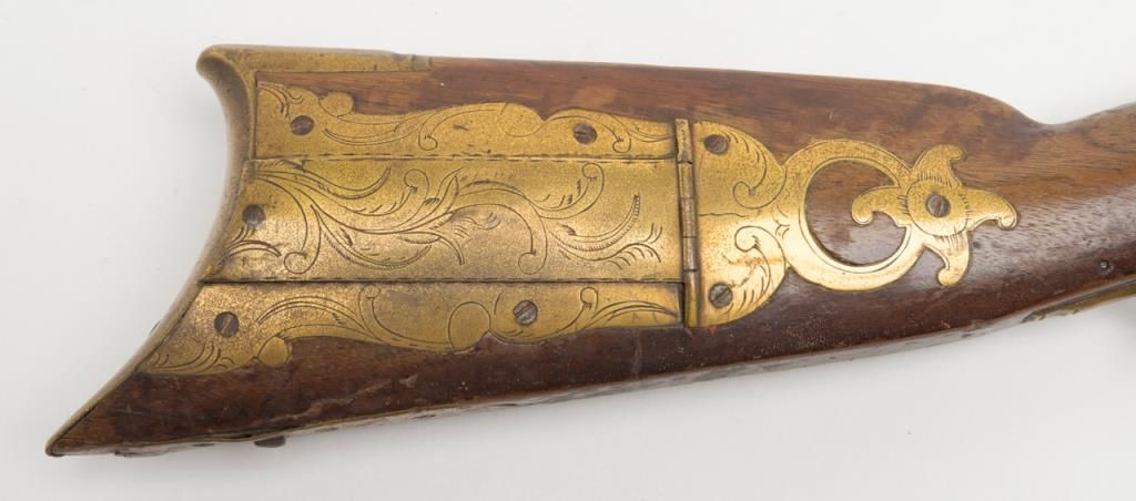 Interesting percussion half stock plains rifle utilizing early Golden age barrel, patch box and butt plate. The barrel shows a remnant of a signature with the 1st letter being “V” and the last 3 letters “KER”. The patch box shows adistinctive finial with good quality engraving and a very nice faceted butt plate and toe plate from the earlier rifle also. The lock and stock appear to be about 1850 by style. The gun measures 44 ½” with the old barrel reduced to 30 ½” with tangadded at that time. Approximately .45 caliber rifled. The stock has been broken and shortened and the condition is fair overall with some repairs to the wood and minor pitting from frontier use. Est.: $350-$700