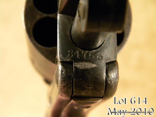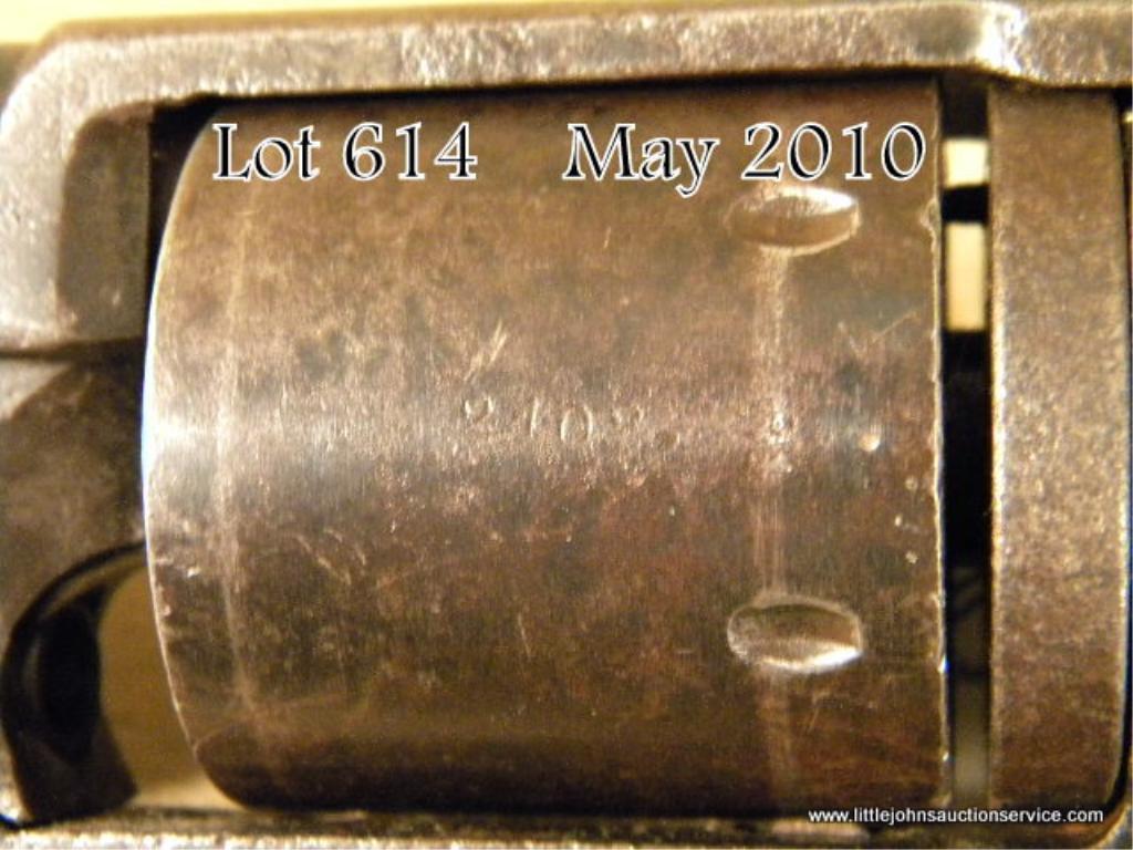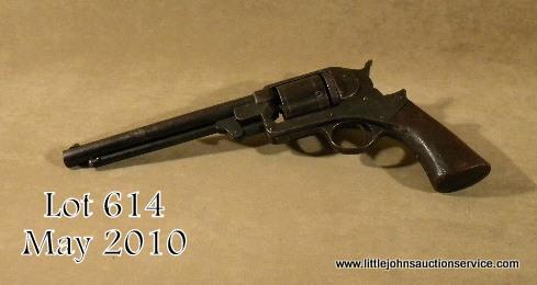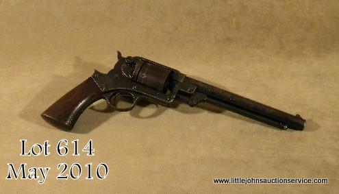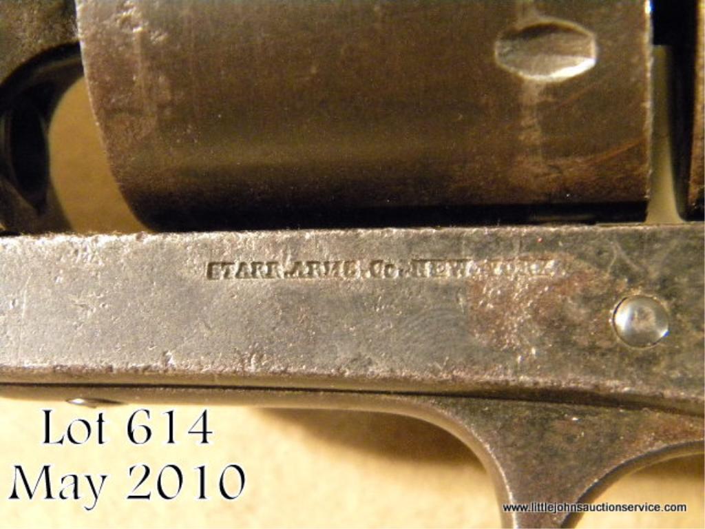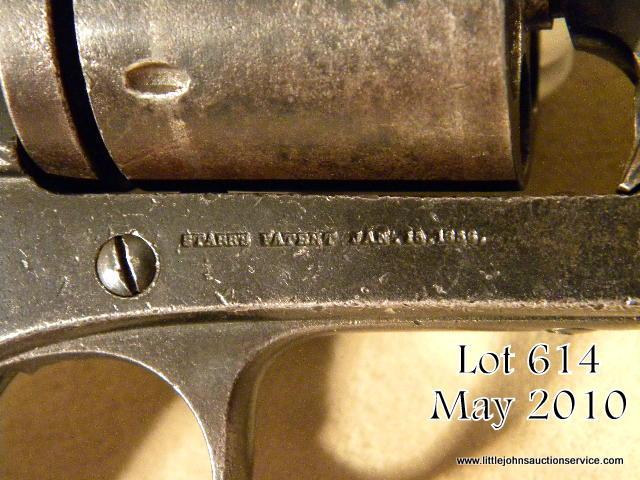 Interesting period conversion to cartridge Starr Single Action Model 1863 revolver, .45 cal., 8” round barrel, blue and case hardened finish, wood grips, #24765. This gun is in overall fair + condition showing a heavy dark patina withscattered areas of light to moderate pitting and erosion on both sides of the frame and barrel, cylinder mismatched, some traces of original blue in protected areas, good action, fair bore, worn but complete grips with scattered nicks and marsfrom carry and storage. A well-done conversion. From the Victor Stouffer Collection. Est.: $800-$1,400.