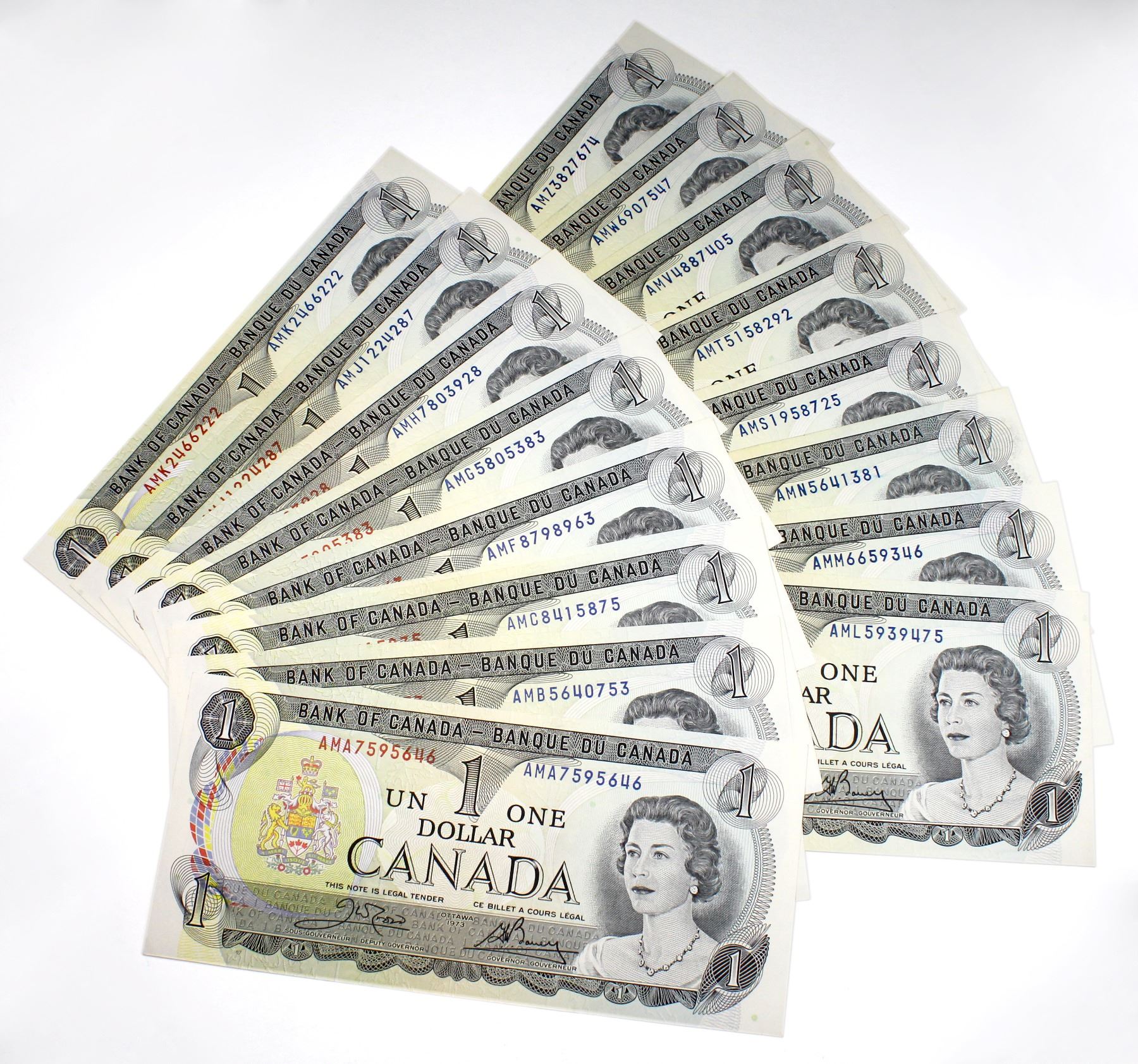 Interesting set of 1973 $1 BC-46b AMA to AMZ prefix Canada Notes, all different prefix letters. Uncirculated. 17pcs