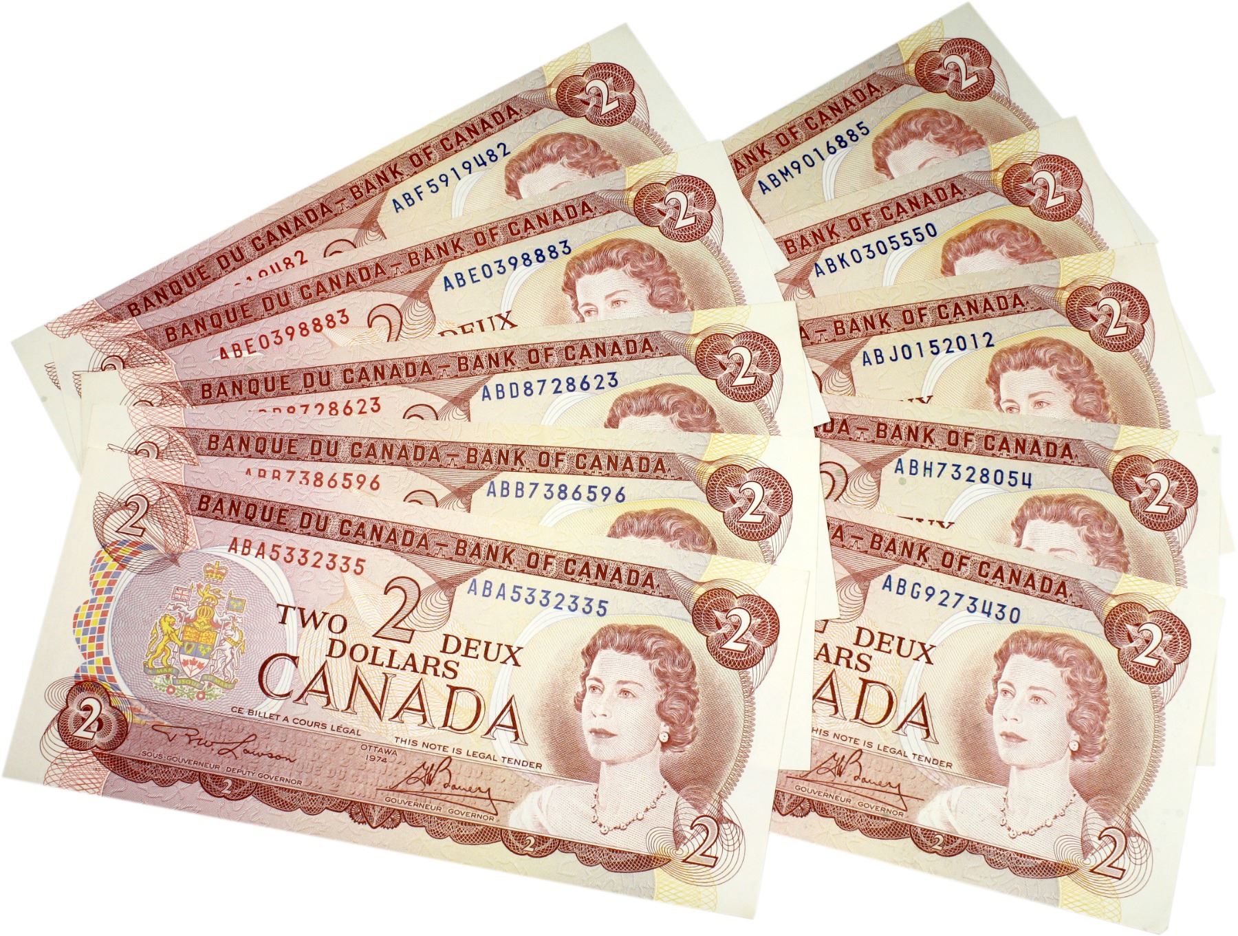 Interesting set of 1974 $2 BC-47a-i Canada Notes, all different prefix letters. Uncirculated. 10pcs