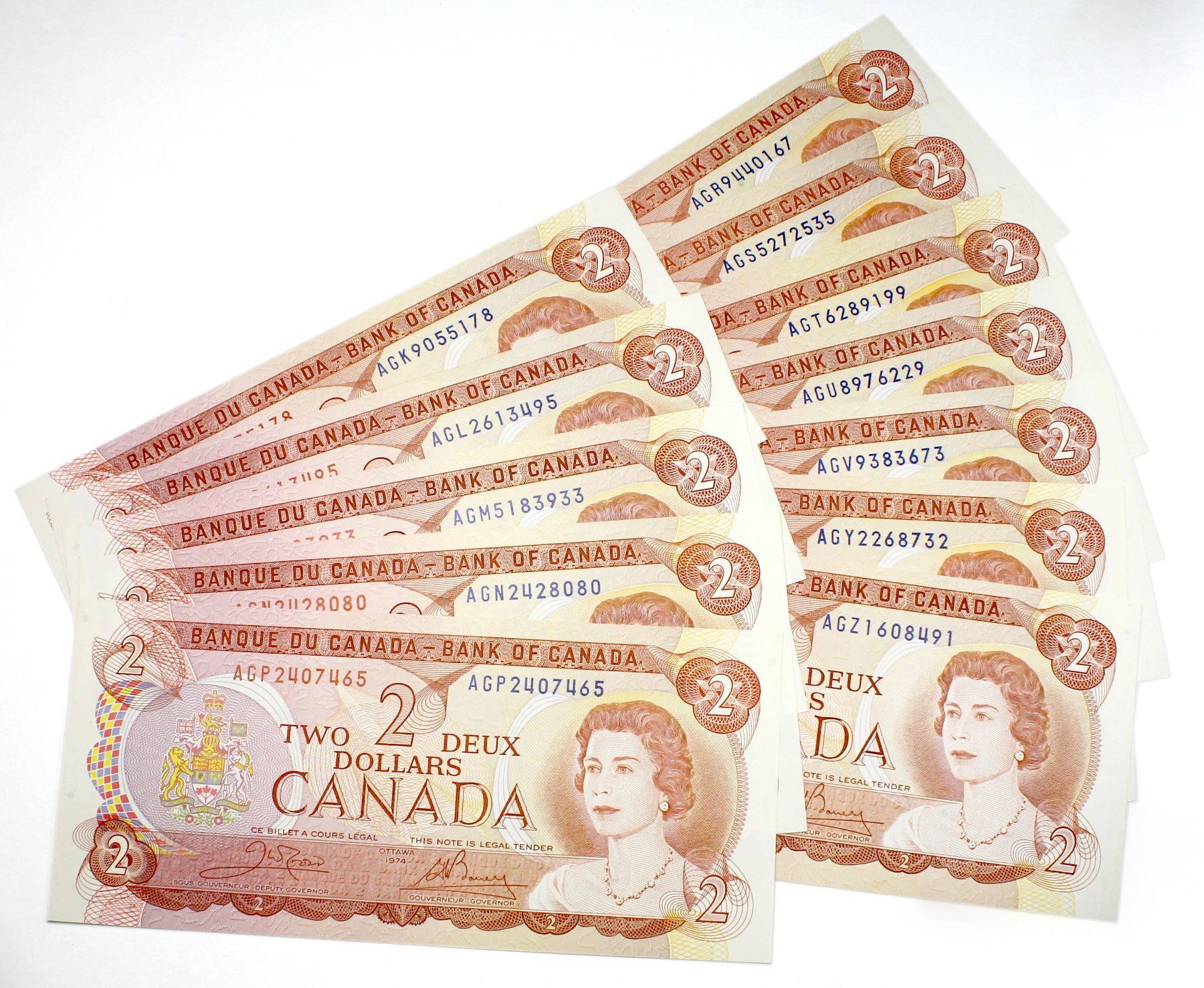 Interesting set of 1974 $2 BC-47b Canada Notes, all different prefix letters. Uncirculated. 13pcs