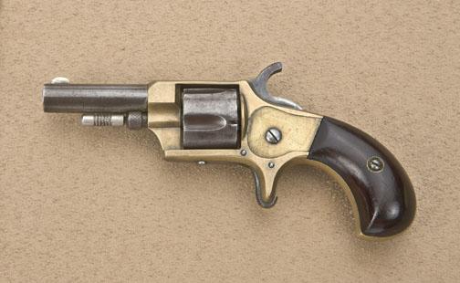 Interesting unmarked American antique spur trigger revolver appearing similar to the Whitney Model No. 1, .22 caliber, 2” barrel, brass frame, rosewood grips, #252. This gun is in overall good condition showing apleasing patina to the brass frame, light grey patina on the iron barrel and cylinder, fair bore, good action, good grips. Est.: $600-$1,200.