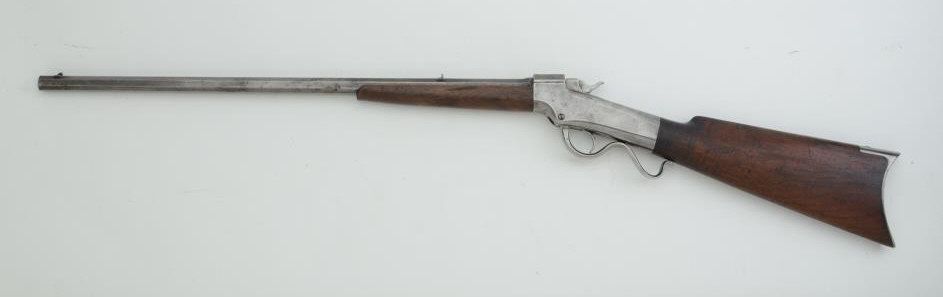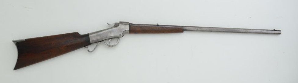 Interesting unmarked falling breech block single shot rifle, with scooped receiver top (appearance similar to a Marlin Ballard), .22 cal., 24” octagon barrel, wood stocks, #35325 in overall good condition with a fairbore, good action, traces of original blue in protected areas with balance a grey patina with some scattered spots of brown; good wood with some scattered mars and scratches from storage. Est.: $350-$700.