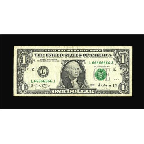 <B>Fr. 1927-L $1 2001 Federal Reserve Note. Fine-Very Fine.</B></I><BR> Interestingly this solid serial number 6 note circulated. The paper quality is appealing and solid for the grade.<BR><BR><b>Shipping:</b> Coins & Currency (<a target="_blank" href="http://www.heritageauctions.com/common/shipping.php">view shipping information</a>)
