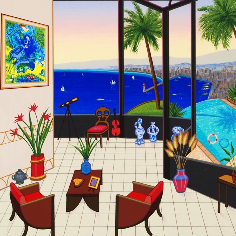 "Interior with Marc Chagall" is a limited edition serigraph on paper, numbered and hand signed by Fanch Ledan. Includes Certificate of Authenticity! Measures approx. 18" x 18" (with border), 16" x 16" (image).