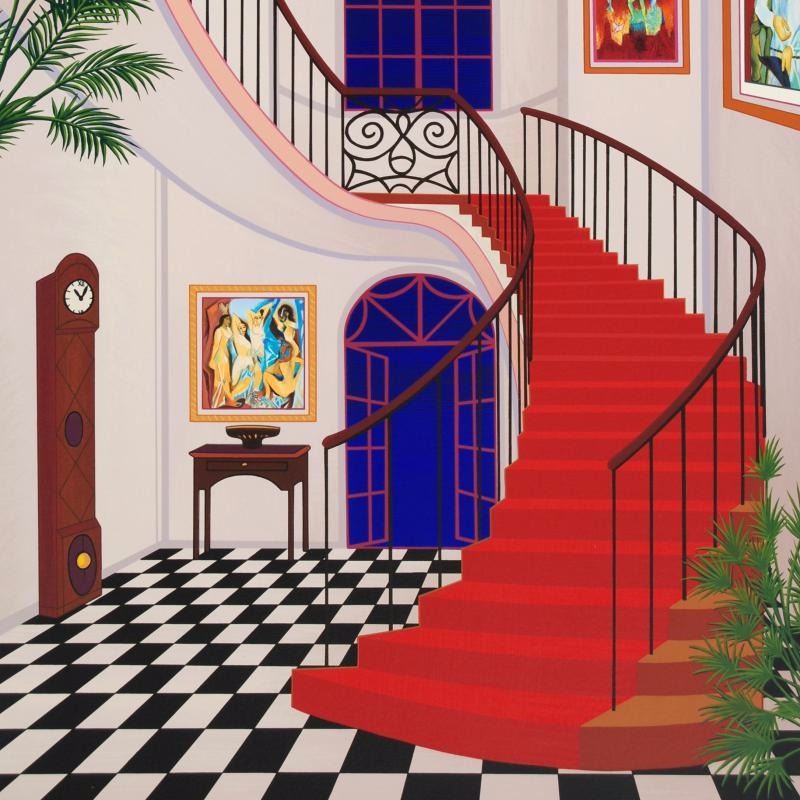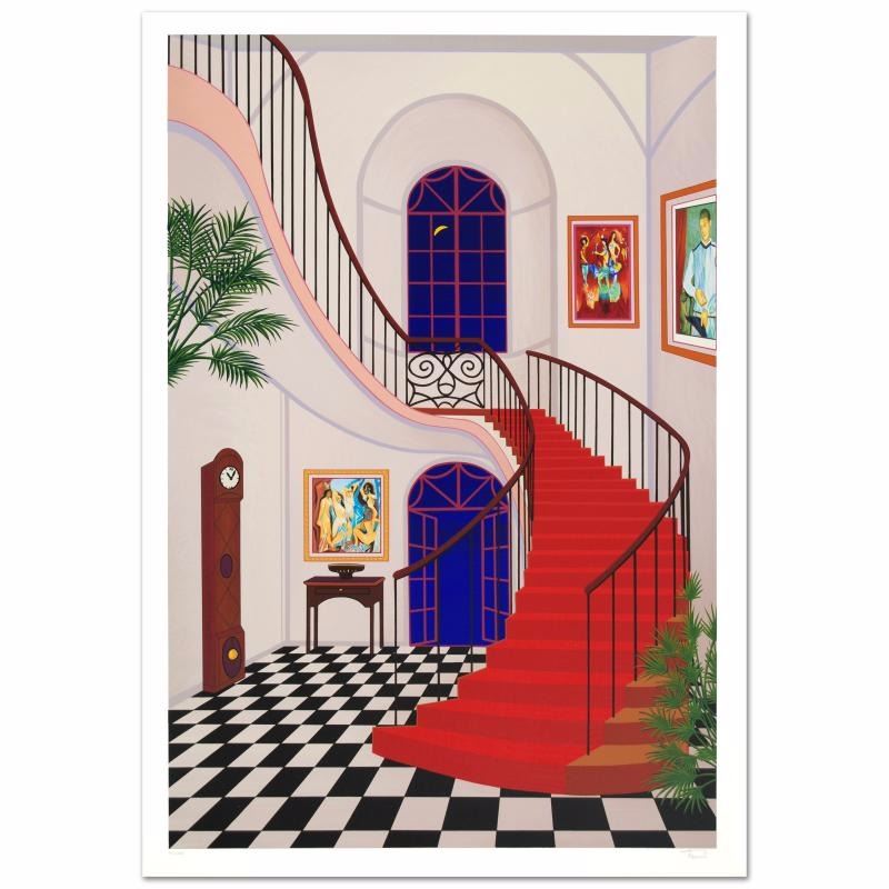 "Interior with Red Staircase" is a limited edition serigraph on paper, numbered and hand signed by Fanch Ledan. Includes Certificate of Authenticity! Measures approx. 25.5" x 36.5" (with border), 23" x 34" (image).