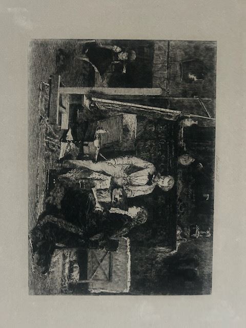 Antigue reproduction of an early etching depicting an artist at work in his studio. 17. x11.75" on paper