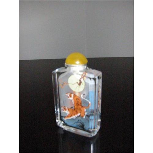 This 3 inch vintage snuff bottle, has hand painted interior animal motif, with original green oriental cardboard box with silk interior. It is beautiful and attractive, near mint condition. The interior has painting of a yellow stripped tiger, with jade color glass topper. This box is 1.5 inch wide, with .5 inch from the sides.. It is beautiful and decorative. something to think about.