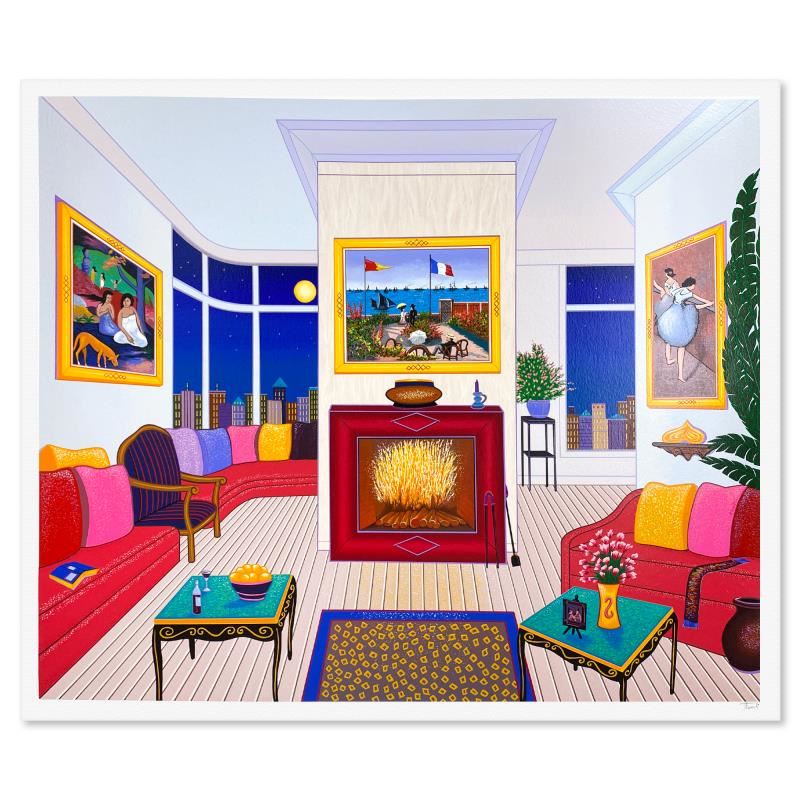 "Interior with Three Masterpieces" is a limited edition serigraph on paper by Fanch, AP numbered and hand signed by the artist. Includes Letter of Authenticity. Measures approx. 32.5" x 38.5" (border), 30" x 36" (image). This proof came from Fanch Ledan's personal collection. It may have some slight imperfections in the image and border, but it's overall condition was inspected and approved by him.