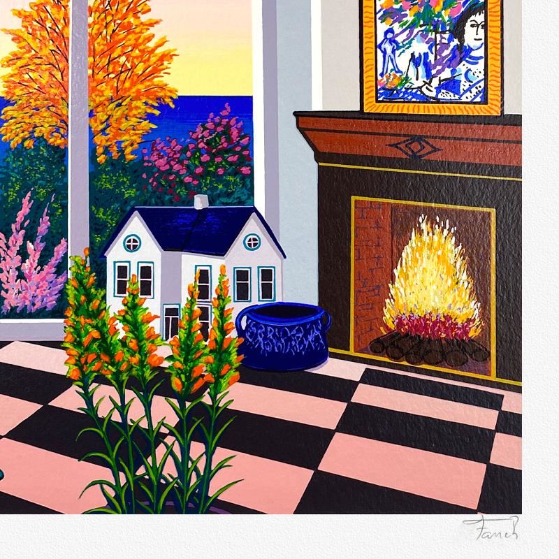 "Interior with Two Chagall" is a limited edition serigraph on paper by Fanch AP numbered and hand signed by the artist. Includes Letter of Authenticity. Measures approx. 16" x 30" (border) 14" x 28" (image). This proof came from Fanch Ledans personal collection. It may have some slight imperfections in the image and border but its overall condition was inspected and approved by him.