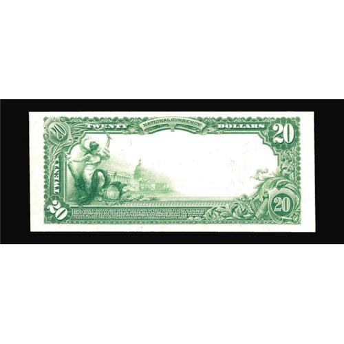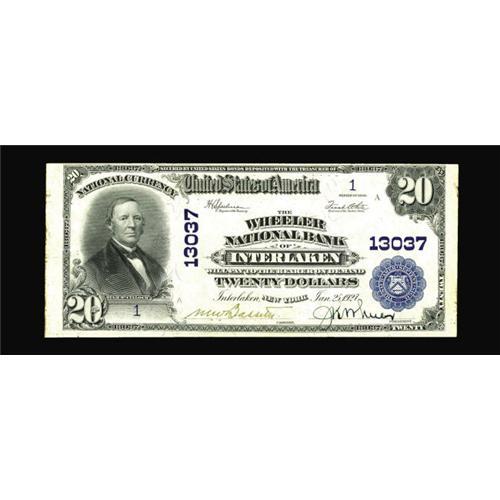 <B>Interlaken, NY</B></I> - $20 1902 Plain Back Fr. 661 <B>The Wheeler NB</B></I> Ch. # 13037<BR>One of the things we love about the currency business is that every day holds the possibility of being Christmas. At a recent coin show this note and its companion below were brought to us by an upstate New York dealer who had purchased a small coin collection in an estate sale. These notes were part of that collection. Not only are they both spectacular examples, but this double serial number 1 $20 is the only large note ever seen from this prohibitively rare issuer. This note is a wonderfully pen signed beauty with gorgeous signatures, including that of this private name bank's owner, James Knight Wheeler, who signs as President. When dealing with the unique, any estimate is strictly a wild guess, but this is a really special item which deserves a place of honor in a really special collection. <B>Choice Crisp Uncirculated.</B></I>