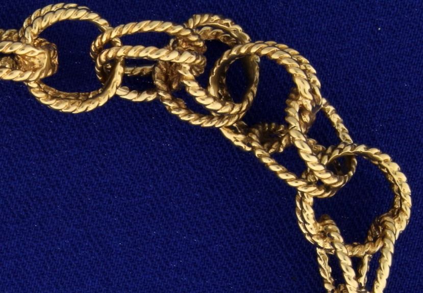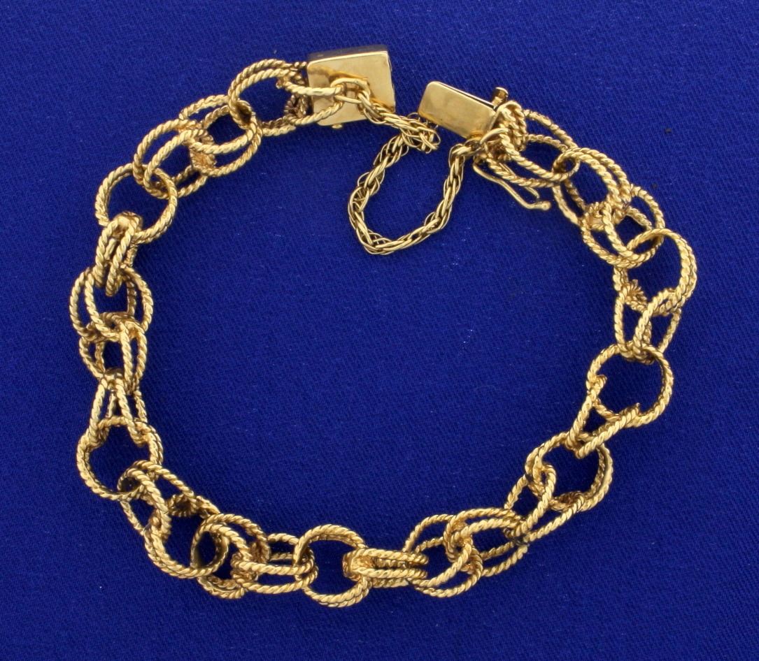 In 14k yellow gold. Charm bracelet is 8 1/2 inches long and 12mm wide with safety clasp and safety chain. 29.9g.