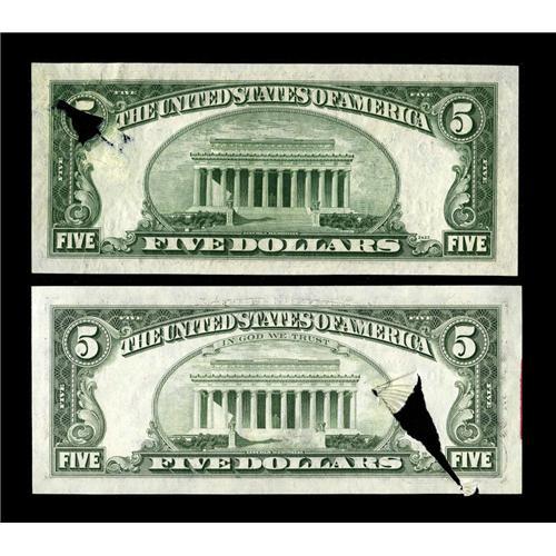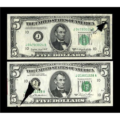 <B>Internal Tear Errors.</B></I><BR><B>Fr. 1964-J $10 1950C Federal Reserve Note. Choice CU</B></I><BR><B>Fr. 1976-J $5 1981 Federal Reserve Note. Choice CU</B></I><BR>The first note has a tear during production in the upper right corner. The second note has an internal tear after the second printing, but before the third printing. This left a "fan-like" Treasury Seal. These types of errors are best exhibited when the tear affects the Treasury Seal. The second note also has red ink along the left-hand edge.<BR><BR><b>Shipping:</b> Coin/Currency (<a target="_blank" href="http://www.heritageauctions.com/common/shipping.php">view shipping information</a>)