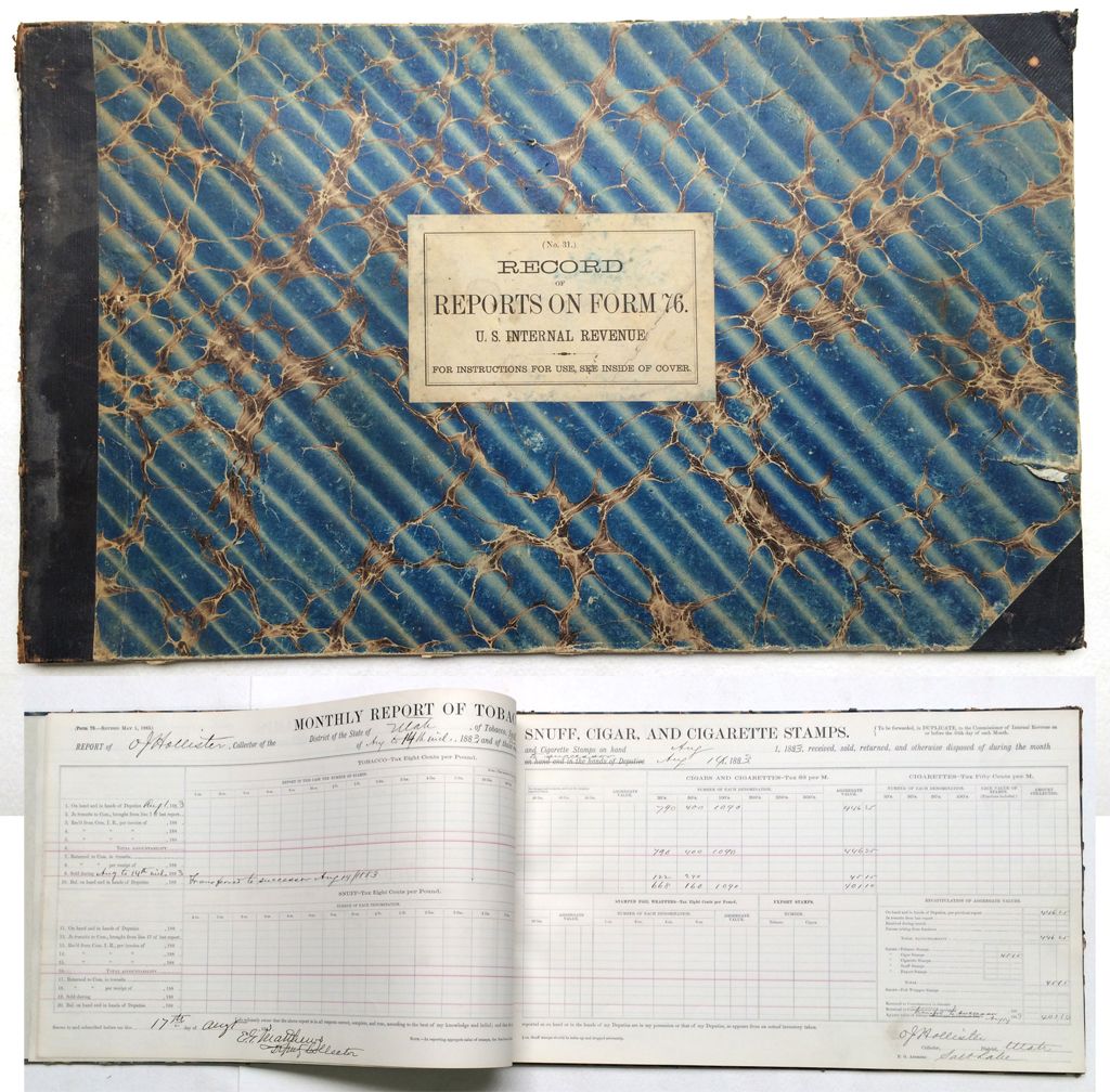 Unusual ledger. Internal revenue reporting of sales of tobacco, snuff, cigar, and cigarette stamps of O. J. Hollister. He only sold cigars, or at least he only reported selling cigars. Four pages used, the rest unused. Cover has some tears and binding issues, but the pages are pristine.