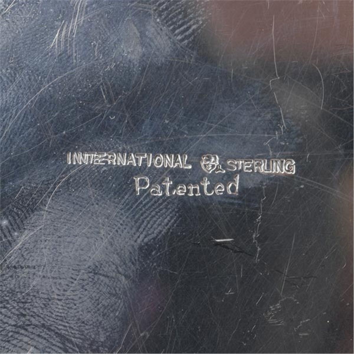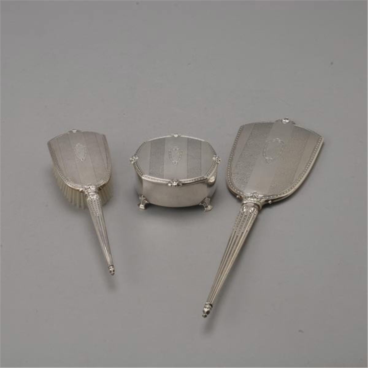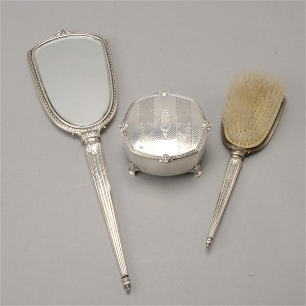 International Three Piece Sterling Mounted Dresser Set, including jewelry box, engraved "Marjorie" {Length of hand mirror 17 3/4 inches}