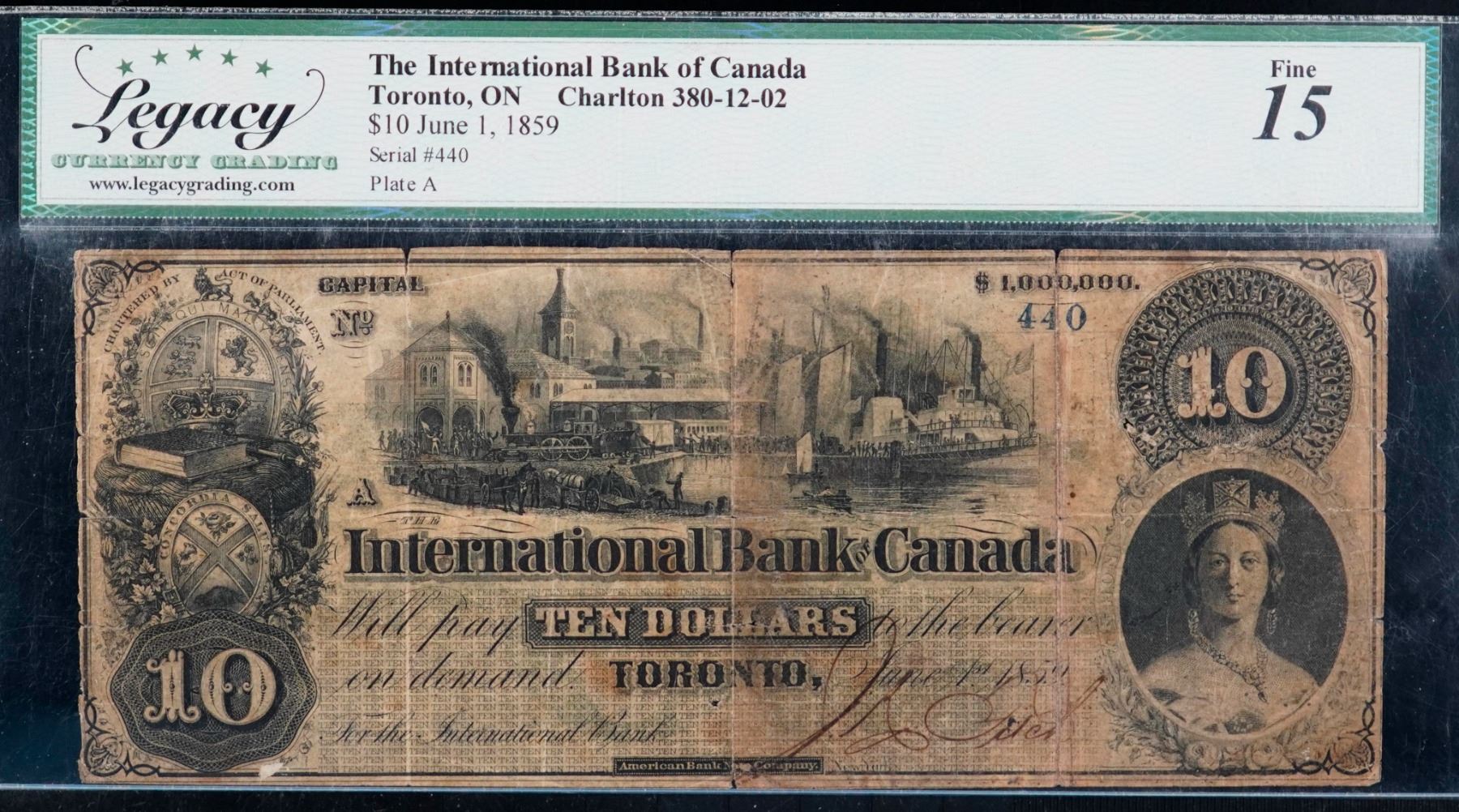 International Bank of Canada 1859 $10 #440 CH-380-12-02 Legacy Currency Grading Choice Fine-15 with minor issues.