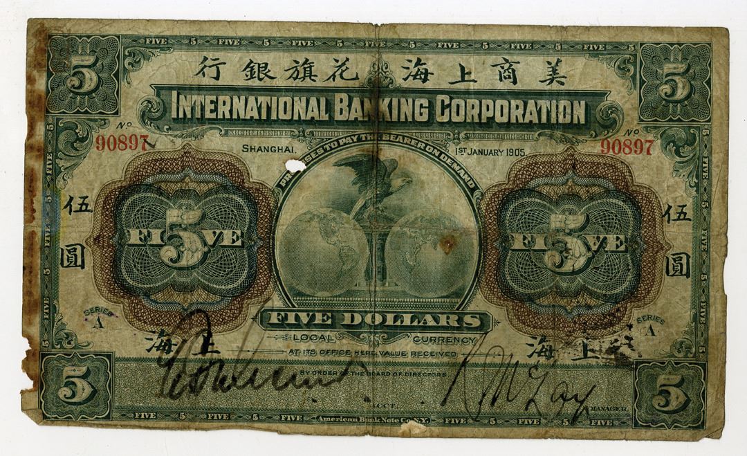 Shanghai, China, 1905. International Banking Corp., $5 Dollars, P-S419a, S/M#M10-2, Issued Banknote, Black on green and m/c underprint, Bald Eagle between hemispheres of the Globe at top, S/N 90897, VG to Fine condition with stains, minor faults, graffiti in 1 small area and a small hole in the middle top left area, ABNC.