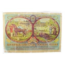 International Colic Cure litho on paper sign, mounted on paper, International Stock Food Co.-Minneapolis, MN, Fair condition, 28"W x 21"H.