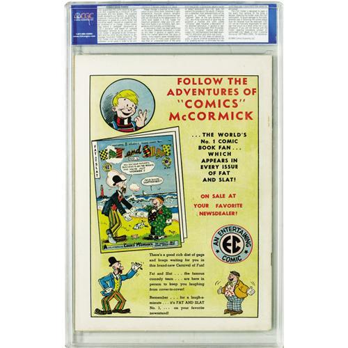 <B>International Comics #4 "D" Copy pedigree (EC, 1947) CGC VF/NM 9.0 Off-white to white pages.</B></I> Kurt Schaffenberger isn't the first artist's name to come to mind when thinking of EC comics, but the man best known for his work on <B>Lois Lane</B></I> years later contributed art to the first four issues of this pre-New Trend title. This issue is rated a Gerber "uncommon", and at 9.0, this copy rates as one of the highest-graded to date by CGC. While CGC has certified this as a Gaines File Copy, no certificate accompanies the book. Overstreet 2006 VF/NM 9.0 value = $358; NM- 9.2 value = $480. CGC census 3/06: 1 in 9.0, 2 higher.