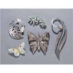 A group of signed sterling silver jewelry. Includes a Los Ballasteros horses head sterling pin, a Delfino swirl hair clip, a sterling pin/pendant w