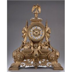 A Victorian gilt bronze mantle clock with central cherub flanked by acanthus leaf details. Late 19th century. With porcelain numerals. Marked on mo