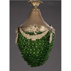 An Art Deco style green patterned hanging lamp. With brass ribbon and swag at top. 1st half 20th century. 17 1/2"l x 11"w.
