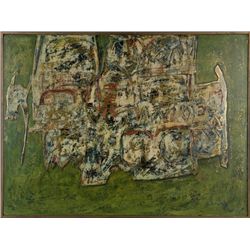 Villacis, Anibal (Ecuador, b. 1927). Green, gilt, and red abstract composition. Signed at l.r., "Anibal Villacis". In painted wood frame...