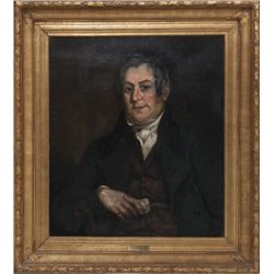 A portrait of a gentleman. Plaque beneath reads, "John Blocker Jr. 1775-1844". 19th century. Unsigned. In gilt gesso frame with acanthus...