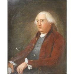 A portrait of gentleman. Plaque beneath reads, "John Blocker Sr. 1740-1800". Oil on canvas. Unsigned. In elaborate gilt gesso frame with...
