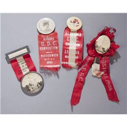 A group of Daughters of the Confederacy badges including 1 celluloid pinback with red ribbon and rosette for 1908 Birmingham, Alabama UDC reunion,