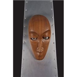An abstract figural sculpture with a metal body and wooden face with glass eyes. Feet protrude from each end. Last quarter 20th century. 90"h...