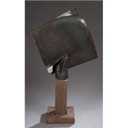 An abstract metal sculpture of geometric form on wooden base. 20th century. 50"h x 33"w x 12 1/2"d.