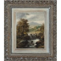 Scenic landscape with river. 19th century. Oil on canvas. Signed at c.l., "Marshall". Elaborate frame with openwork. 21" x 17"...