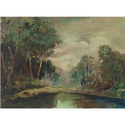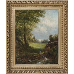 Landscape scene with clearing and stream. 19th century. Oil on canvasboard. Signed at l.l., possibly, "MS Bloodgood". Carved wood frame....