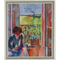 Buckner, Melvin (D.C./Puerto Rico, 1915-2010). "The Balcony". A young woman before an open window revealing a garden outside. Acrylic on...