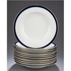 A Hutschenreuther porcelain china set in the 1914 century anniversary pattern with cobalt and gilt rims. Set is comprised of 123 pieces: 11 cups, 22