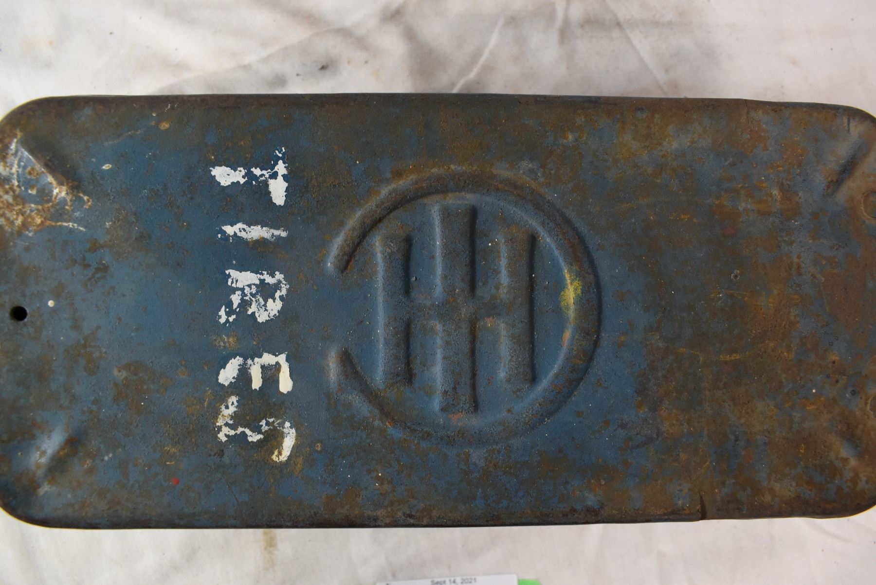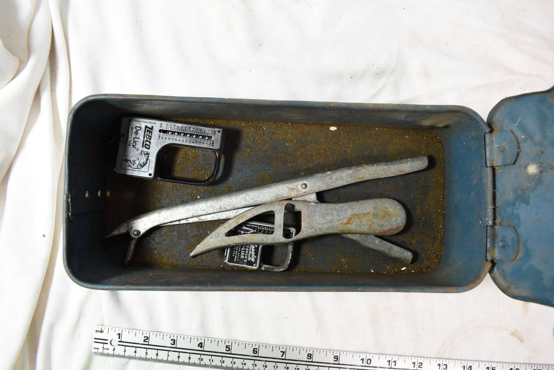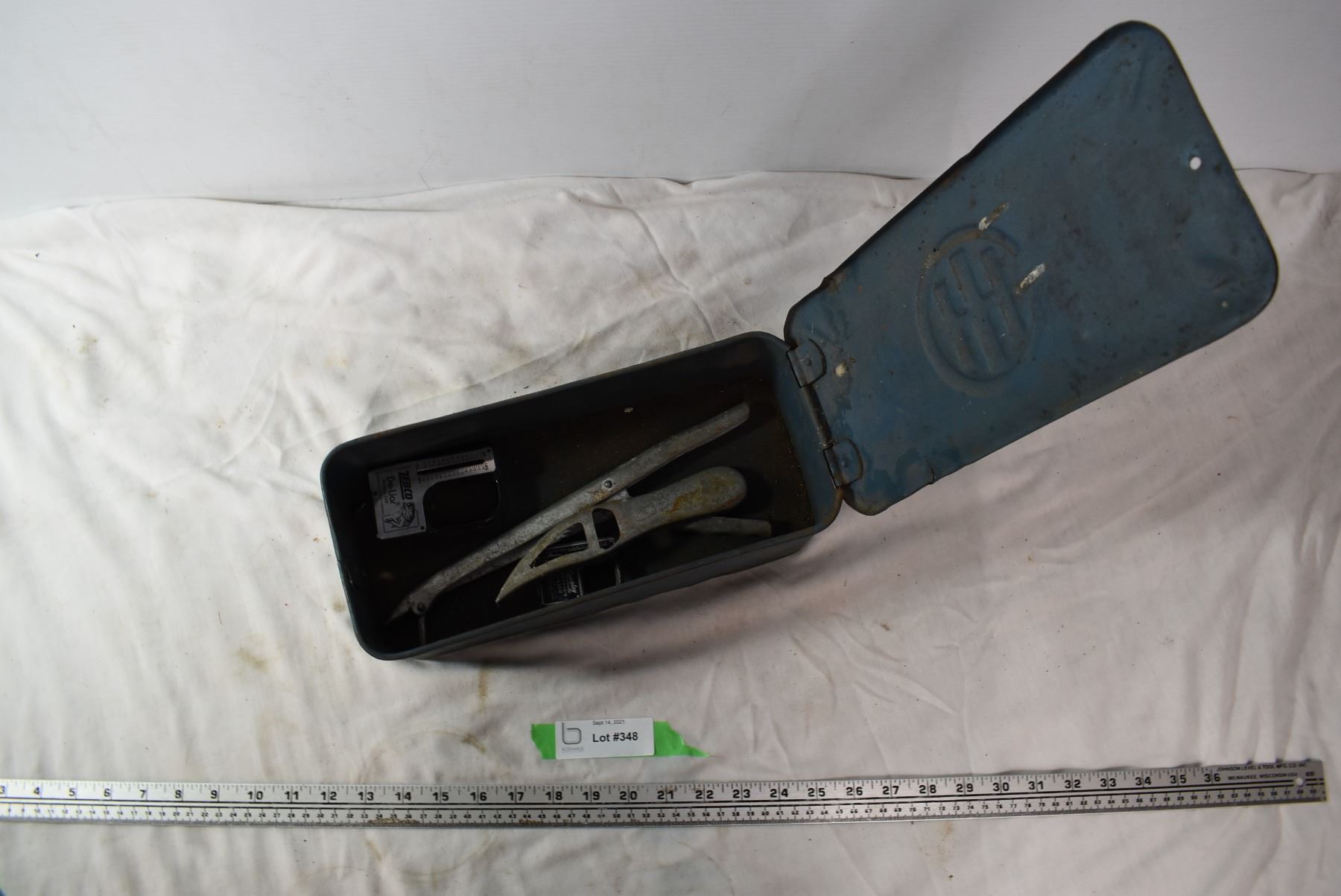 International Harvester box with fishing items. 2 fish scales, pliers, fish scaler