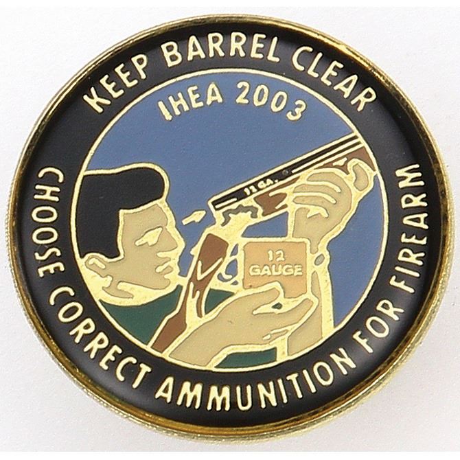 1" diameter. Black and color enamel finish with IHEA 2003 - Keep Barrel Clear - Choose Correct Ammunition For Firearm artwork. Brass pin back. These are from the original Schrade factory in Ellenville, NY. Bulk packed.