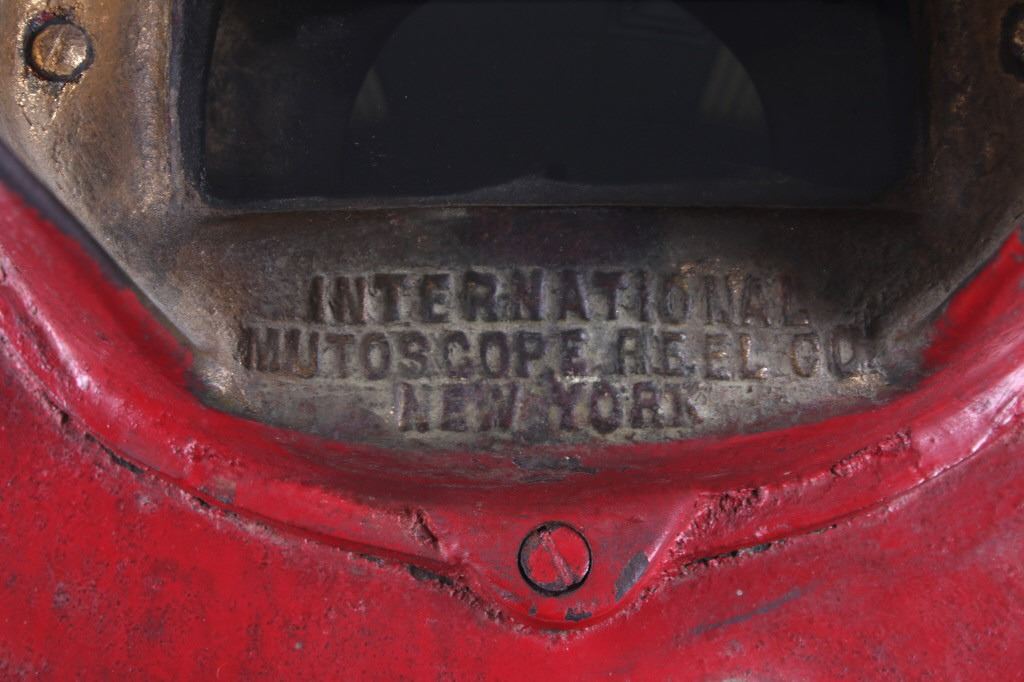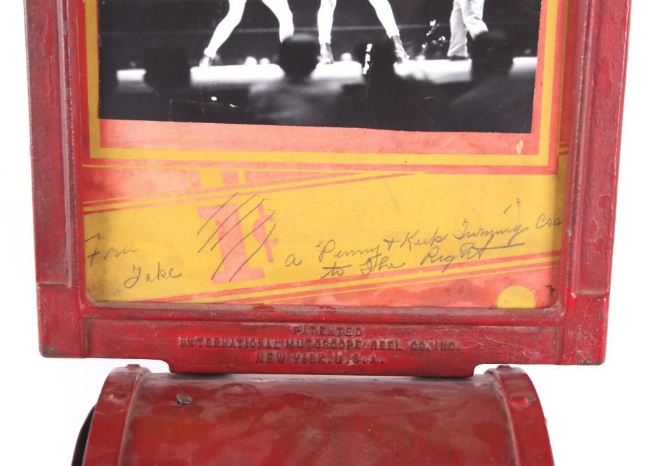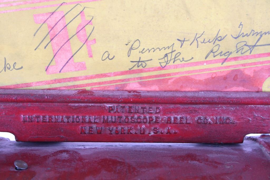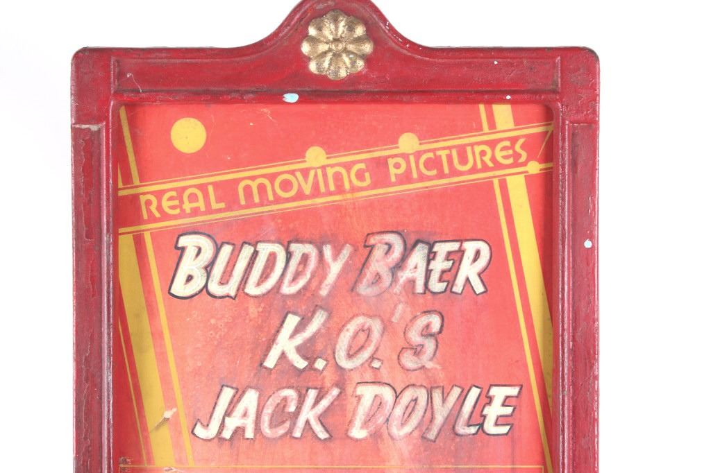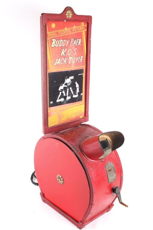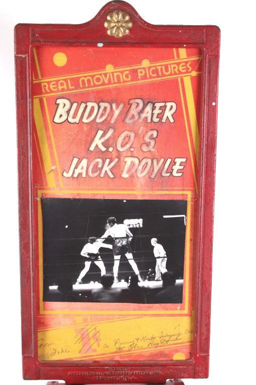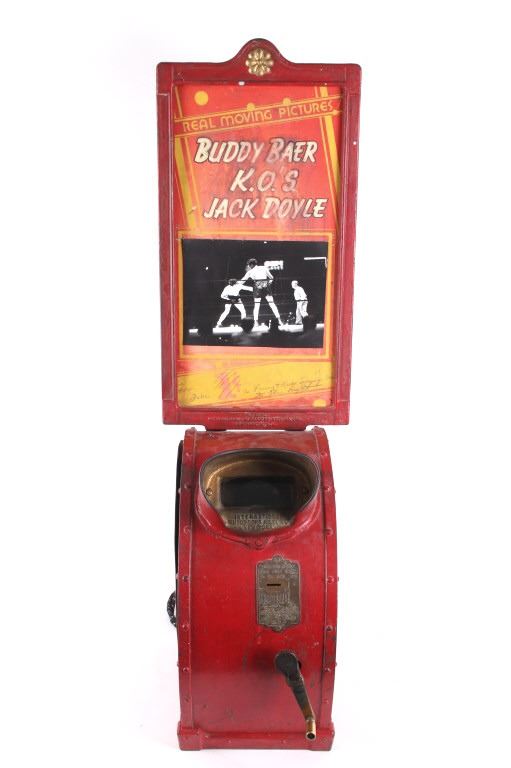 Featured in this lot is this International Mutoscope Co. reel movie viewer. The viewer features marking at the bottom of the sign reading Patented - International Mutoscope Co. Inc. - New York, U.S.A. The viewer is marked near the lens reads: International Mutoscope Co. - New York. The viewer shows that it works and has been plugged in and shows a scene from Charlie Chaplan where he performs slapstick comedy on the street with a guy that comes out of a store. The advertisement of the sign is of Buddy Baer K.O.'s Jack Doyle and features a photograph of the K.O. underneath the title. To operate the machine you plug it in and turn the spindle located underneath the lens and it turns the reel inside the machine. The condition of this mutoscope reel machine is fair to good with a nail holding the reel compartment closed and shows some modern repair to the sign on top of the machine but is in otherwise fair to good overall condition. The measurements of this machine are 40 1/4" x 11 3/4" x 20 1/2".
